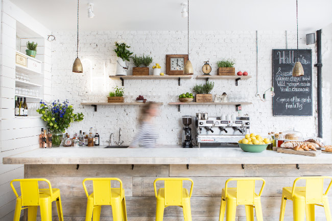 A beach café-style deli where white wood and brick bounce the sunlight around and form an original coast atmosphere, and the tables made from scaffold boards have been left with the scars from their former life like sandblasted driftwood. This particular scaffold material creates the bar, which is lacking in a glass display top, instead being crowned with gorgeous long piece of marble.