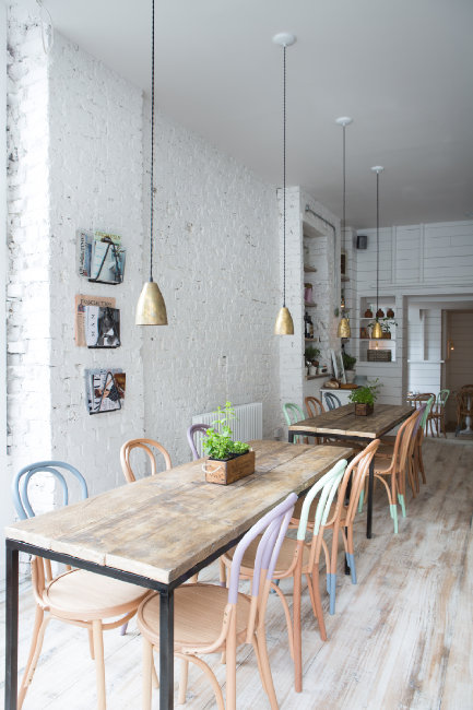 To stop the interior fading into insignificance, the raw wooden dining chairs have been dip-dyed in pastels to compliment the soft furnishings, and some solid industrial colour comes from the Tolix-style bar stools. A nice stretch of West Coast beach culture that some lucky Londoners can reach in their lunchtime.